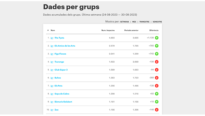 Aquest divendres, 8 de setembre, el mitjà de la música en català, Viasona, celebra el seu 13è aniversari i ho fa amb el llançament d’una nova plataforma creada a partir de big data que permet analitzar i fer un retrat d’aquells grups de música i cantants en català que són tendència. El que fa aquesta innovació tecnològica és analitzar la navegació dels usuaris i recopilar informació sobre l’ampli conjunt d’artistes i grups d’arreu dels Països Catalans registrats a Viasona per tal d’examinar-ne l’impacte i la popularitat. Es tracta d’una eina inèdita perquè, no només permet veure a temps real quins són els grups de música en català més consultats, sinó que es pot fer un anàlisi comparatiu i evolutiu que fins ara fins ara cap altra plataforma permetia fer-ho de manera pública. Els motius de la popularitat poden ser diversos: des de l’impacte d’una campanya de comunicació fins a l’impacte d’un fet d’actualitat relacionat amb l’artista o grup. L’objectiu és que aquesta pugui ser una eina útil per a programadors musicals, discogràfiques, productores, agències de management i, en definitiva, per a tota la indústria musical per tal de detectar el talent emergent i consolidat, i tenir un nou sistema d’avaluació de l’impacte, l’èxit i el posicionament dels artistes i grups de música en català. |